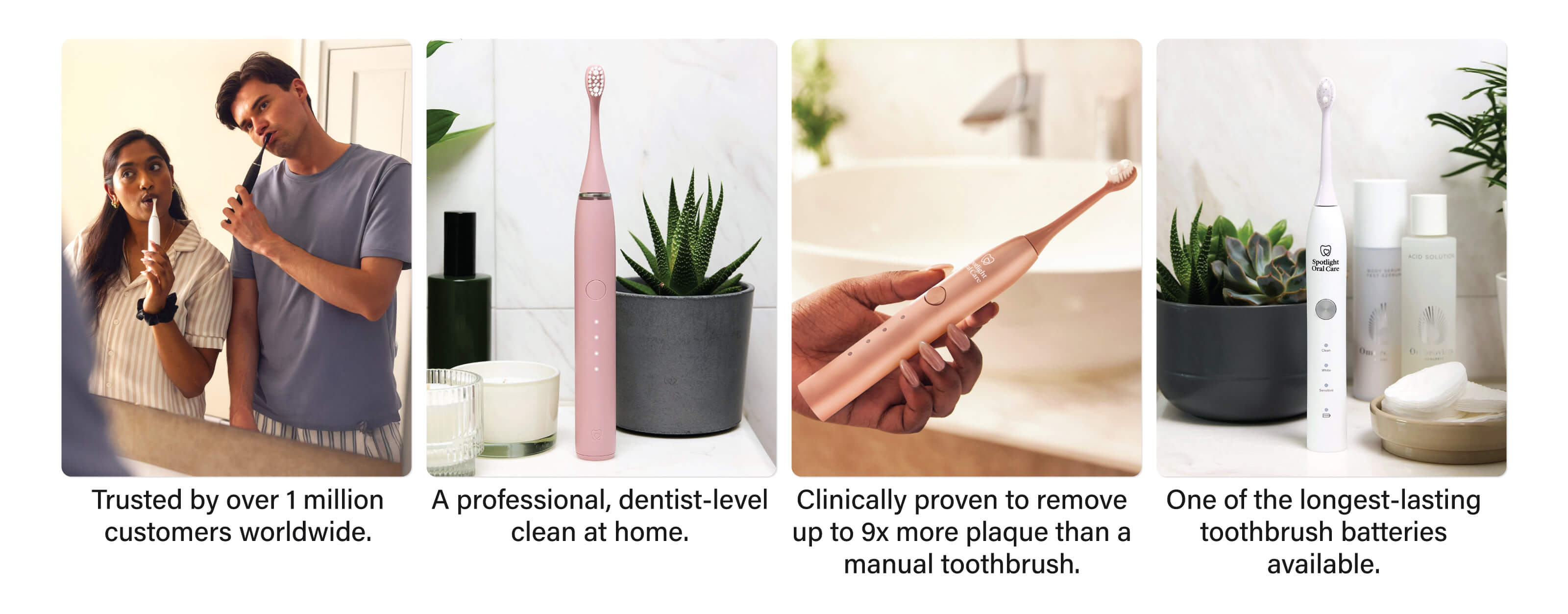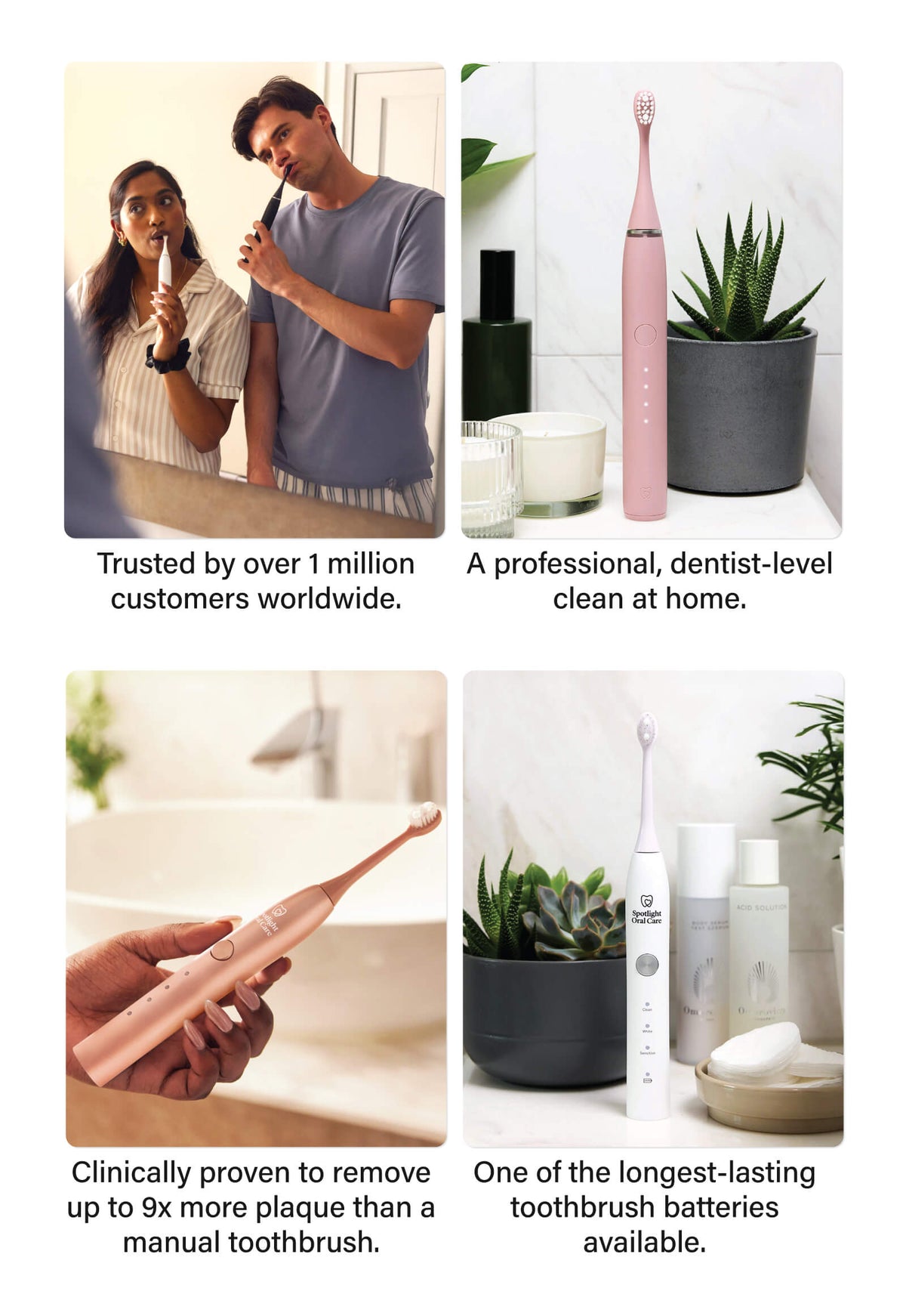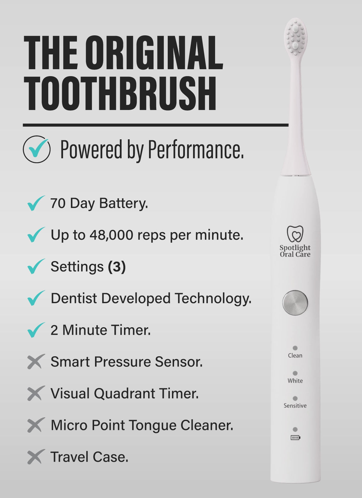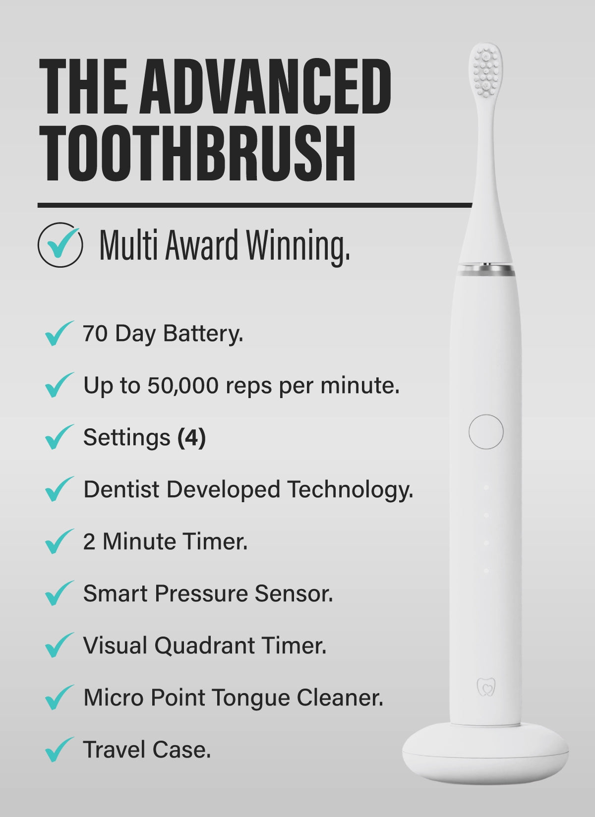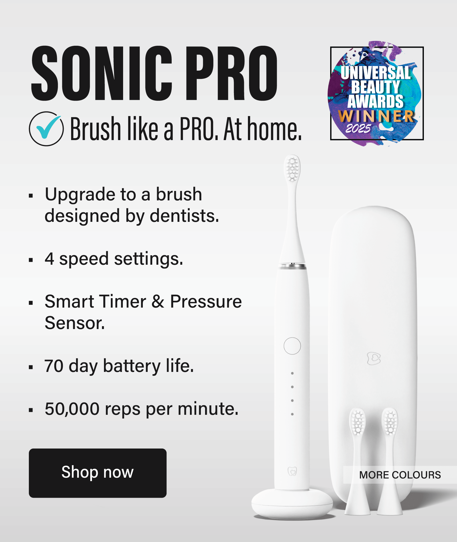 The Sonic Pro Toothbrush works in the same way as the Sonic, using high-frequency brush movements to ensure a deep and thorough clean. However, the Sonic Pro has an additional setting “Polish” which reaches 50,000 reps per minute. The Sonic Pro also features a Pressure Sensor to protect gums from excessive brushing, a Micro Point Tongue Cleaner to help alleviate bad breath, and a two-minute Visual Quadrant Timer.