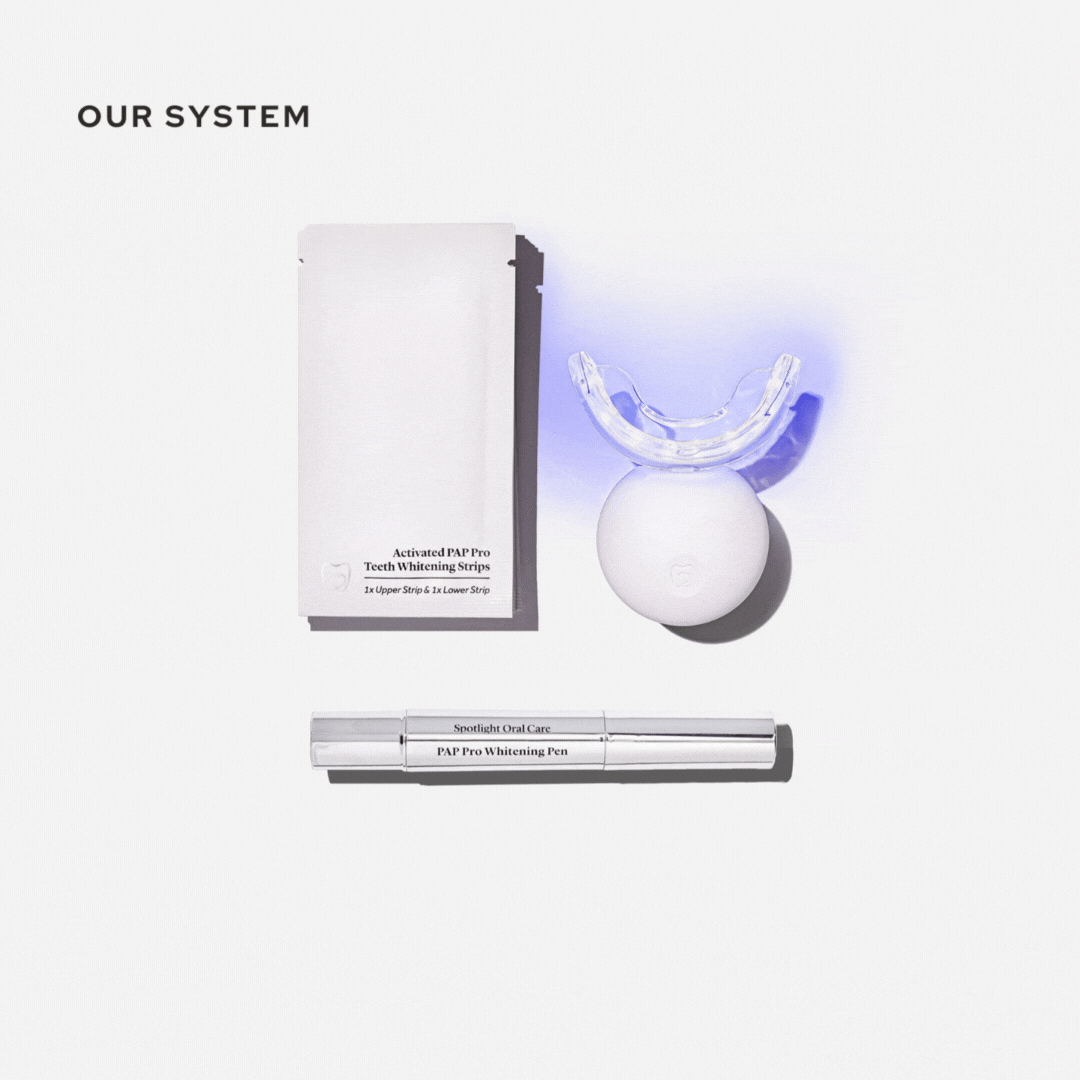 They contain a combination of Hydrogen Peroxide and PAP for enhanced whitening and Hydroxyapatite for remineralising your teeth. The strips are activated by the LED light.