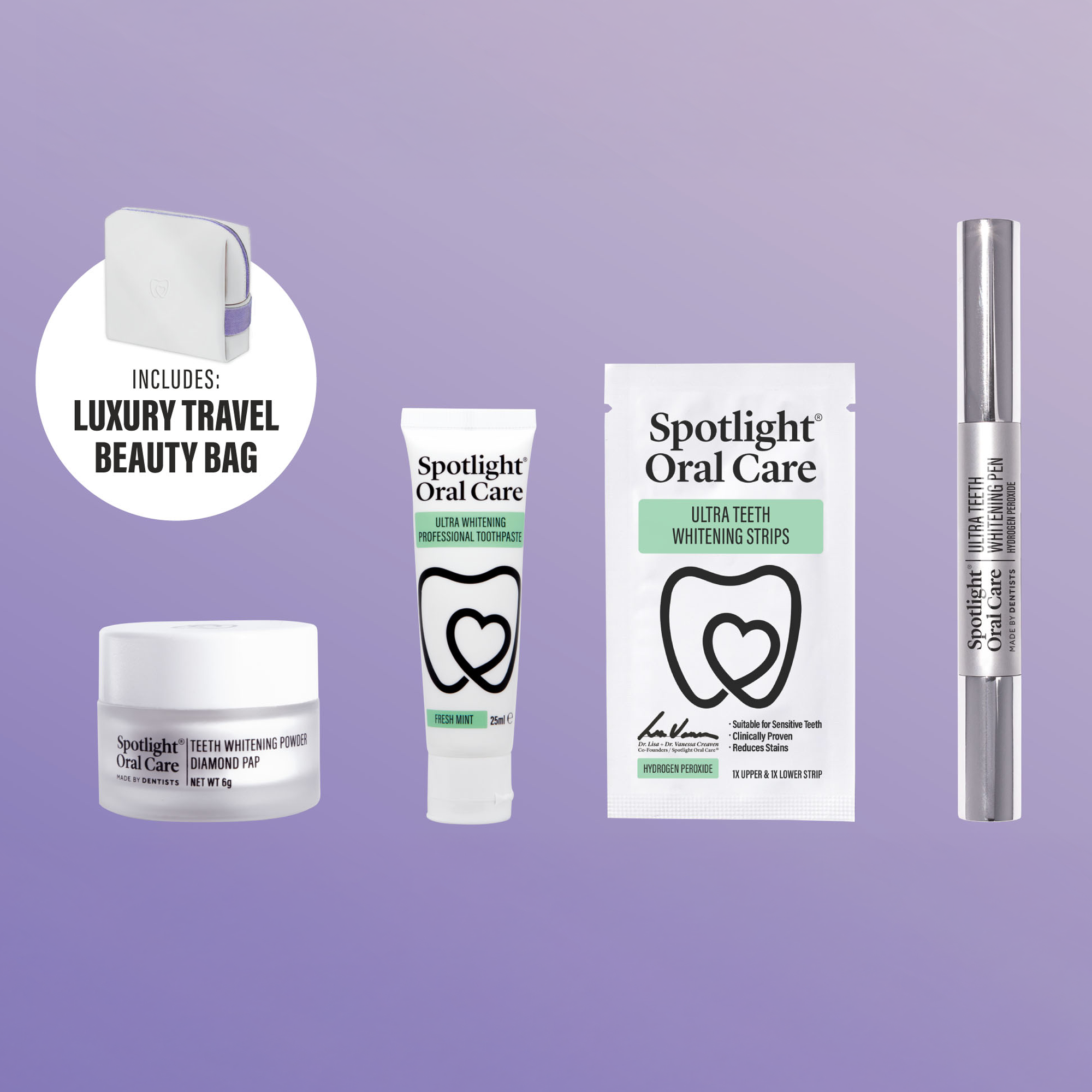Experience a premium oral care routine with our hero collection to whiten teeth safely at home and on the go, complete with a luxury travel beauty bag. Including our best-selling whitening products, developed by dentists, in travel-friendly sizes, these are ideal for you if looking to top up on your favourites and treat yourself or gift to someone who makes you smile.