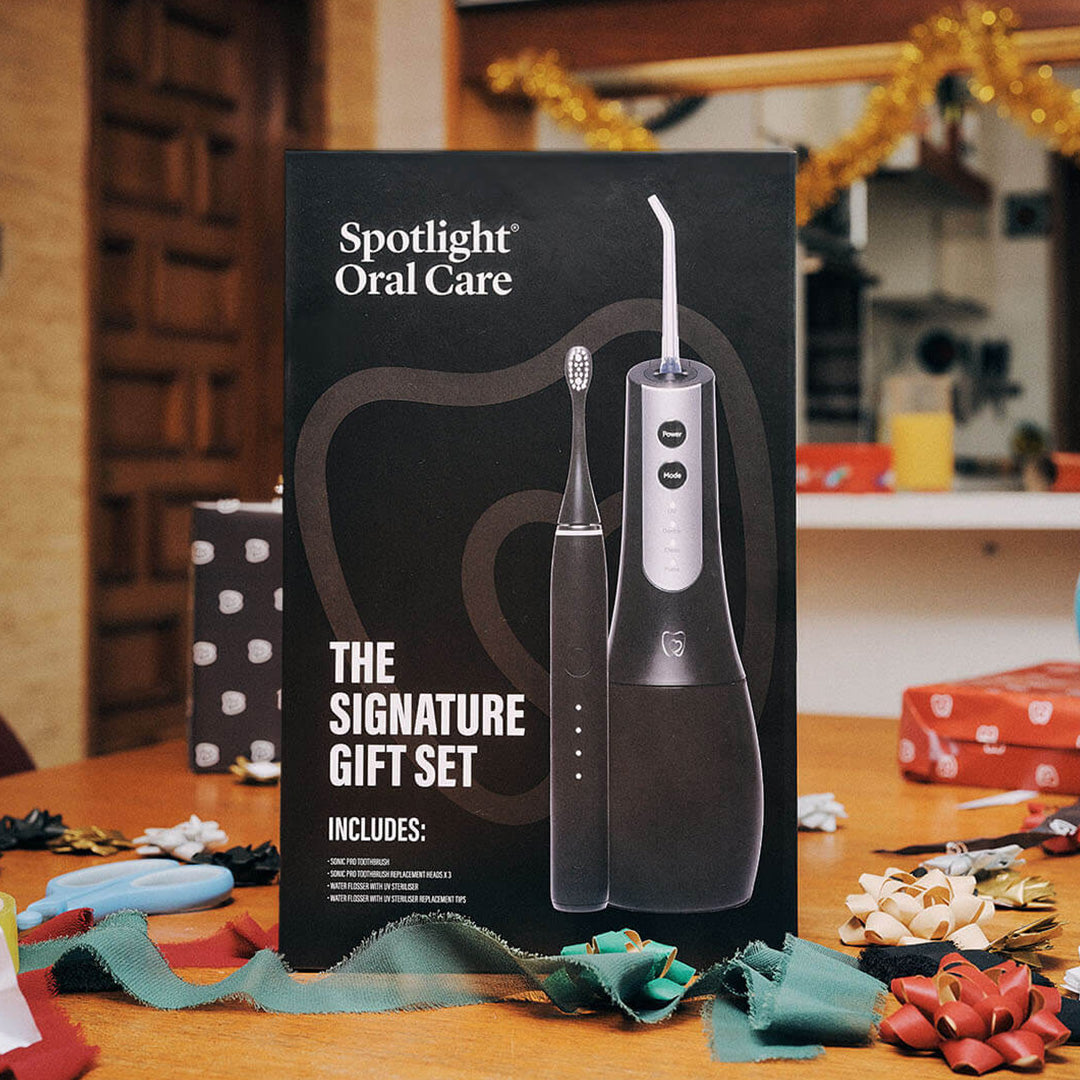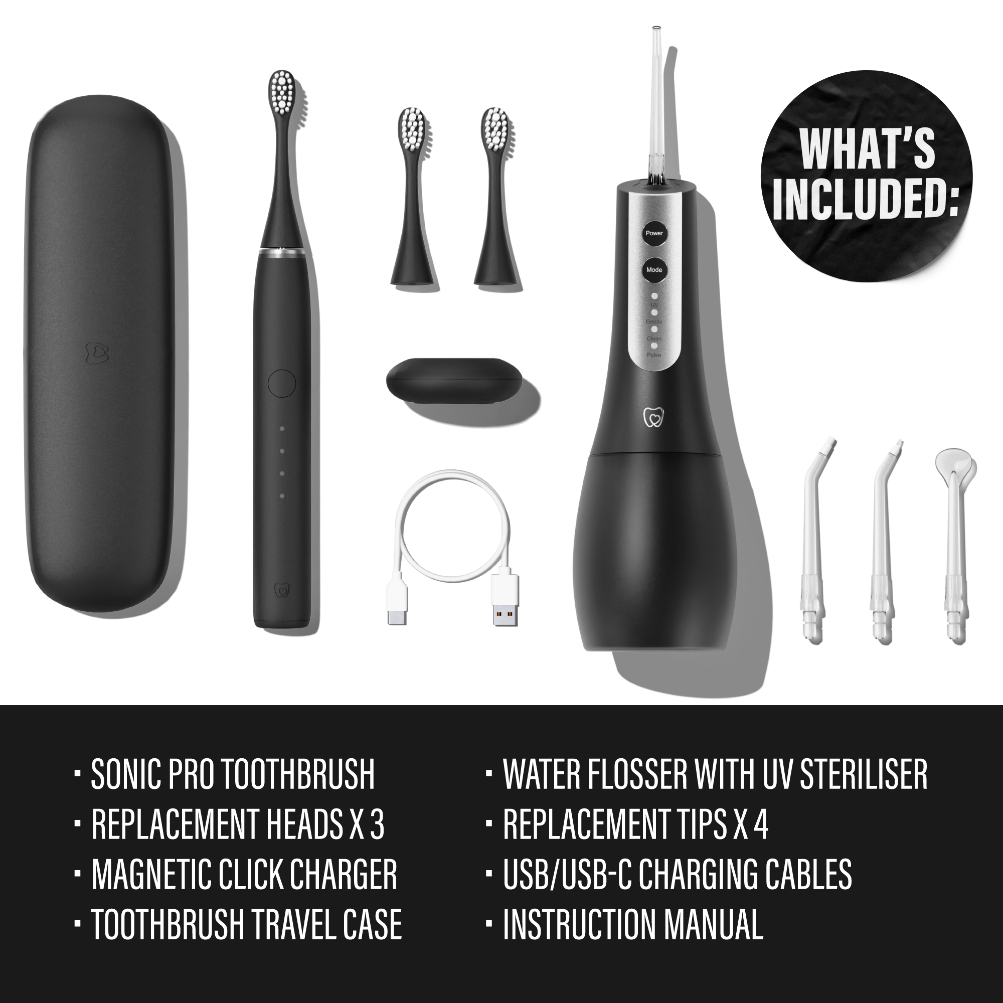 The best selling Sonic Pro Jet Black Electric Toothbrush and the matching Water Flosser with UV Steriliser in a luxury gift box ideal for gifting yourself or someone special this season.